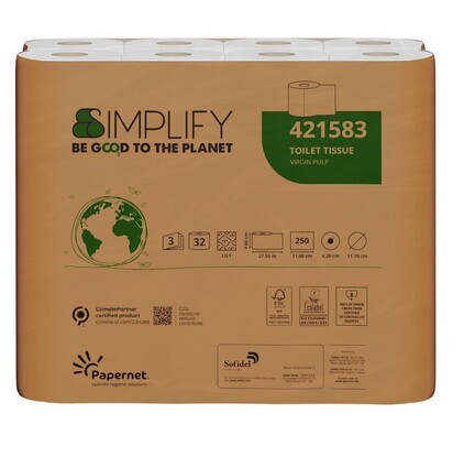 Simplify toiletpapir fra Papernet kombinerer høj hygiejnestandard med bæredygtighed. Som en del af den CO₂-neutrale produktserie er det skånsomt mod både hud og natur. Ideel til dem der ønsker komfort uden at gå på kompromis med miljøet.
